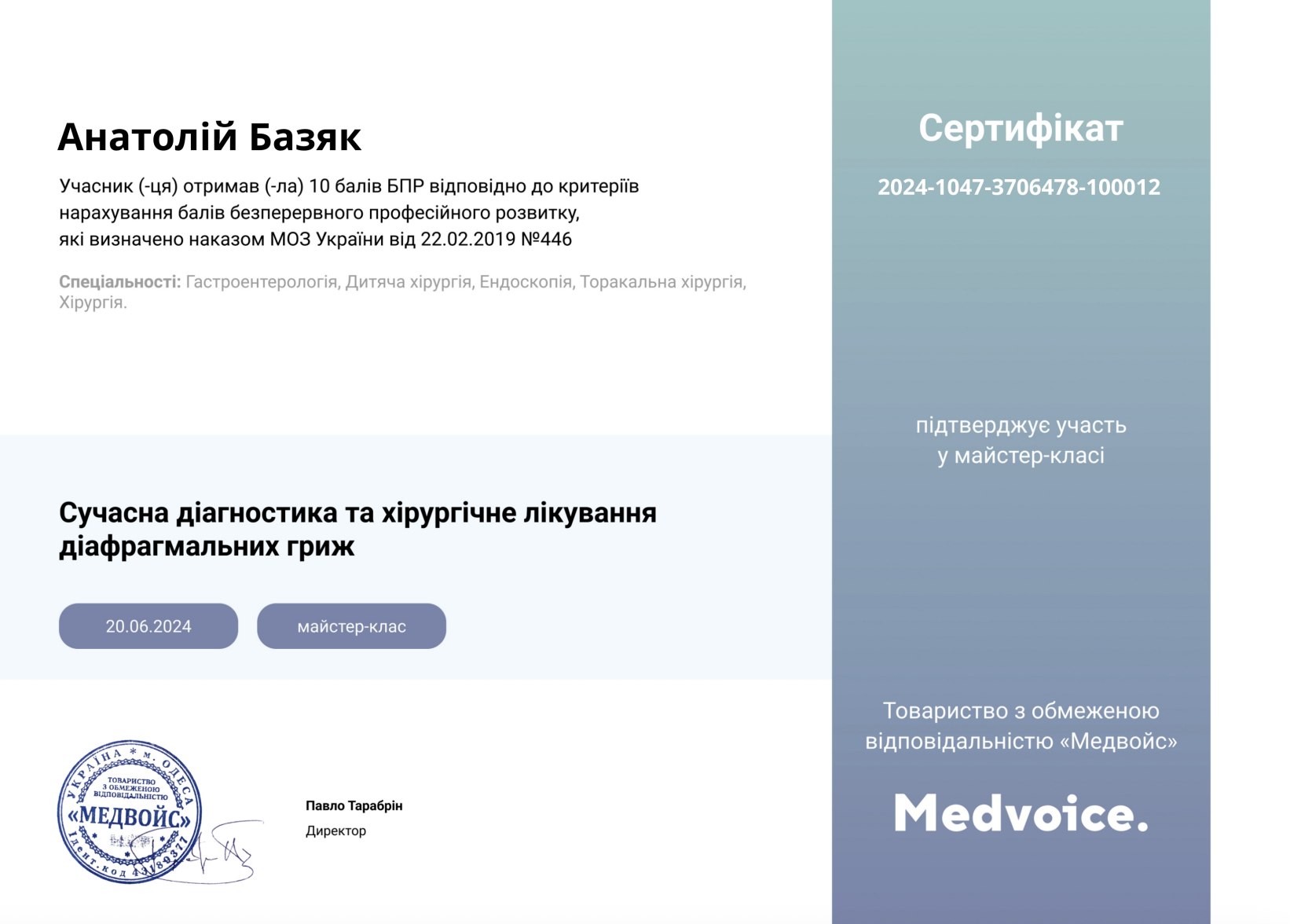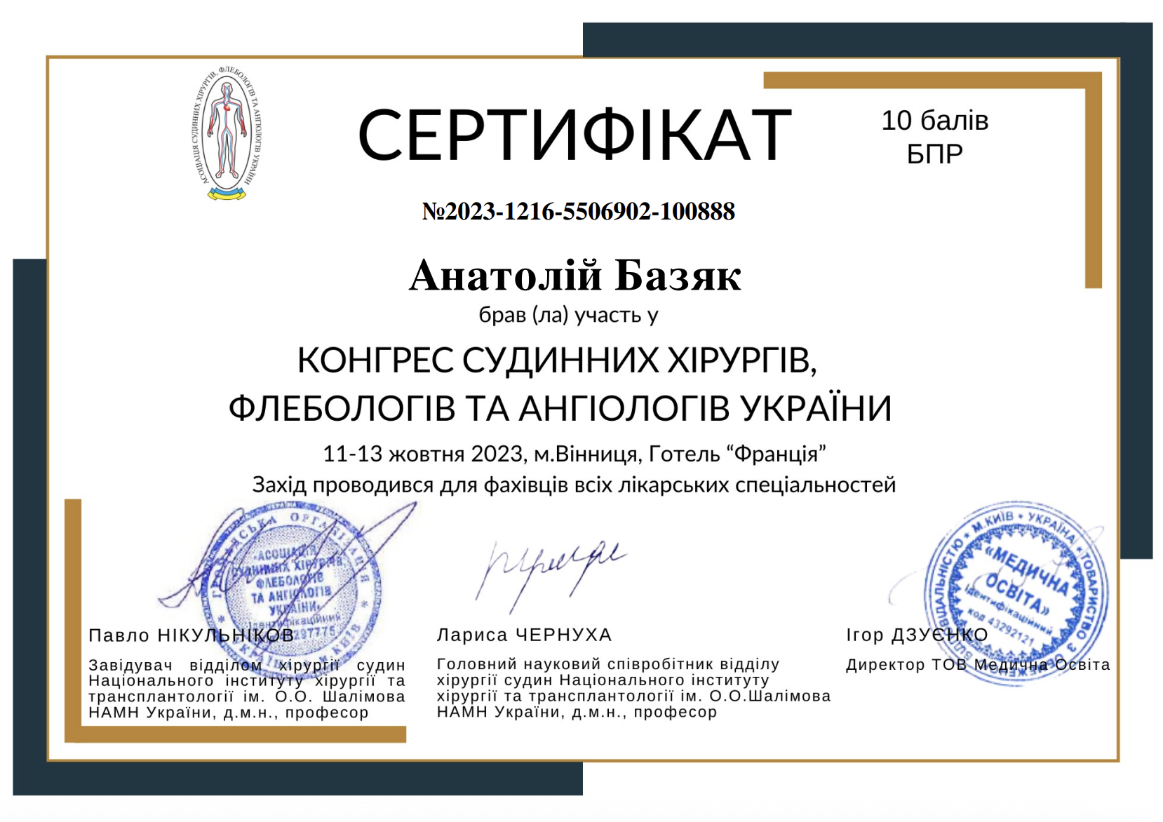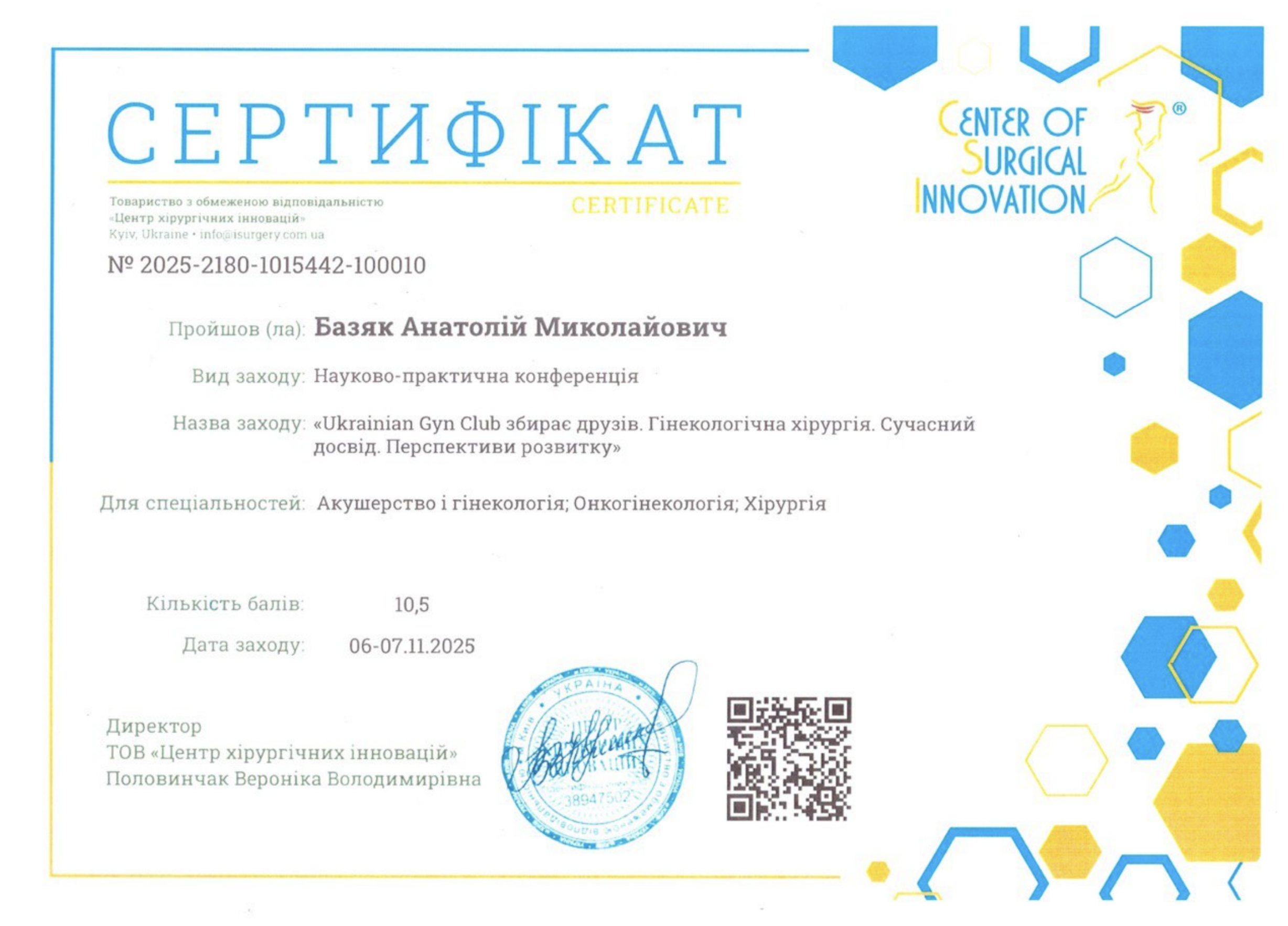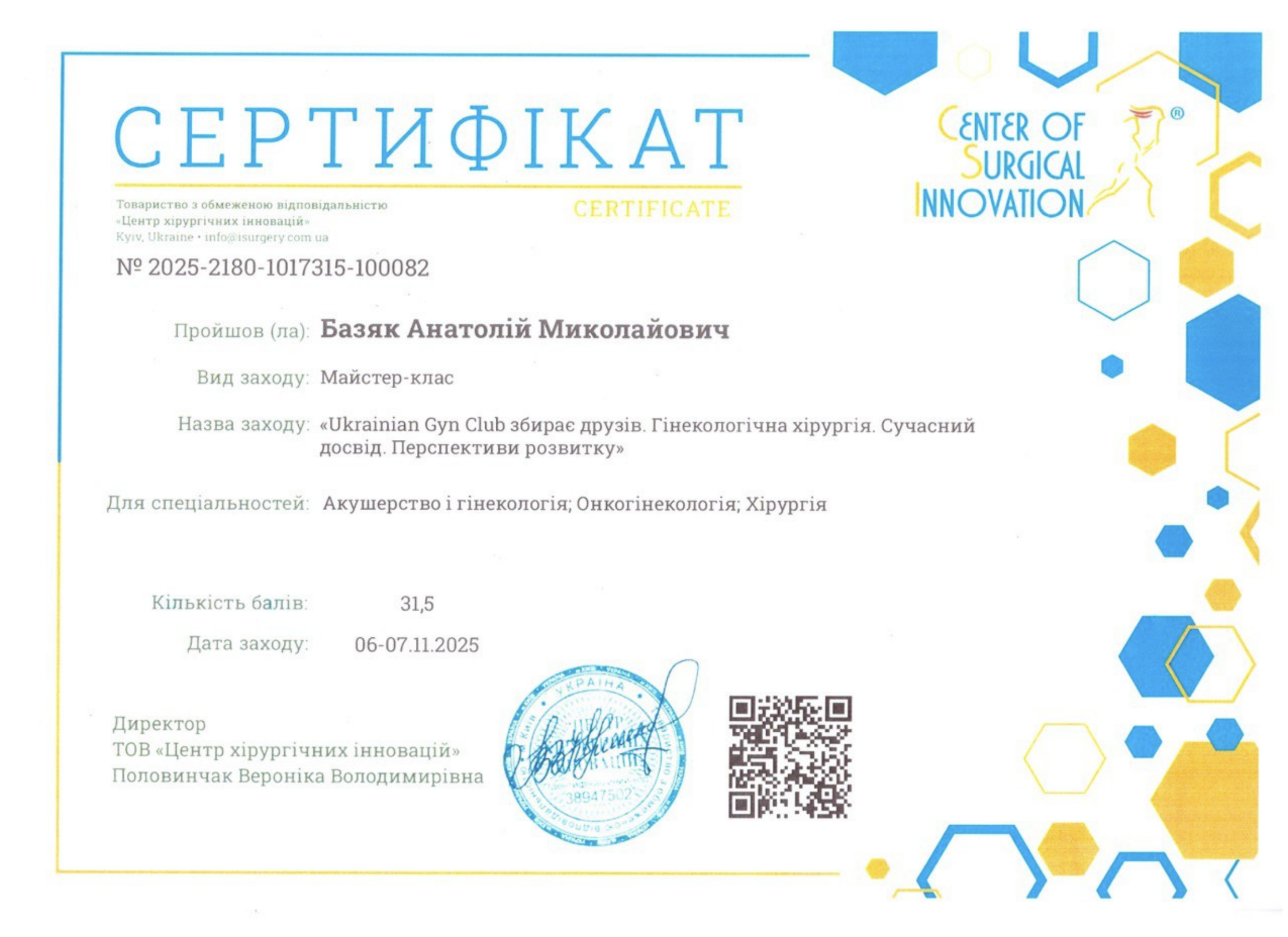 Керівник медичного центру, лікар-хірург, флеболог, онкогінеколог вищої категорії