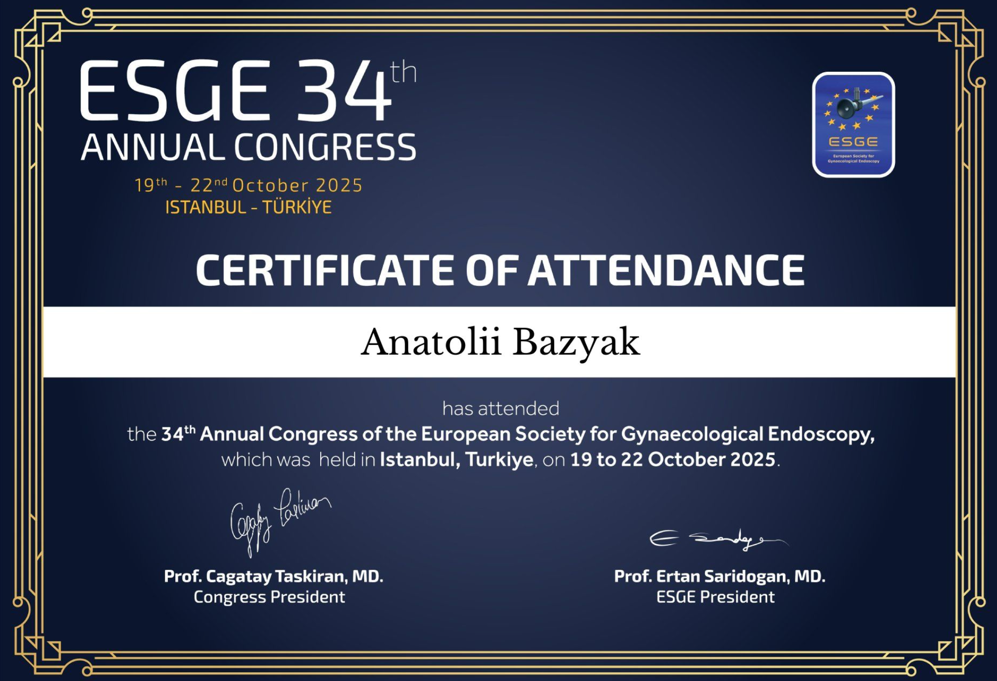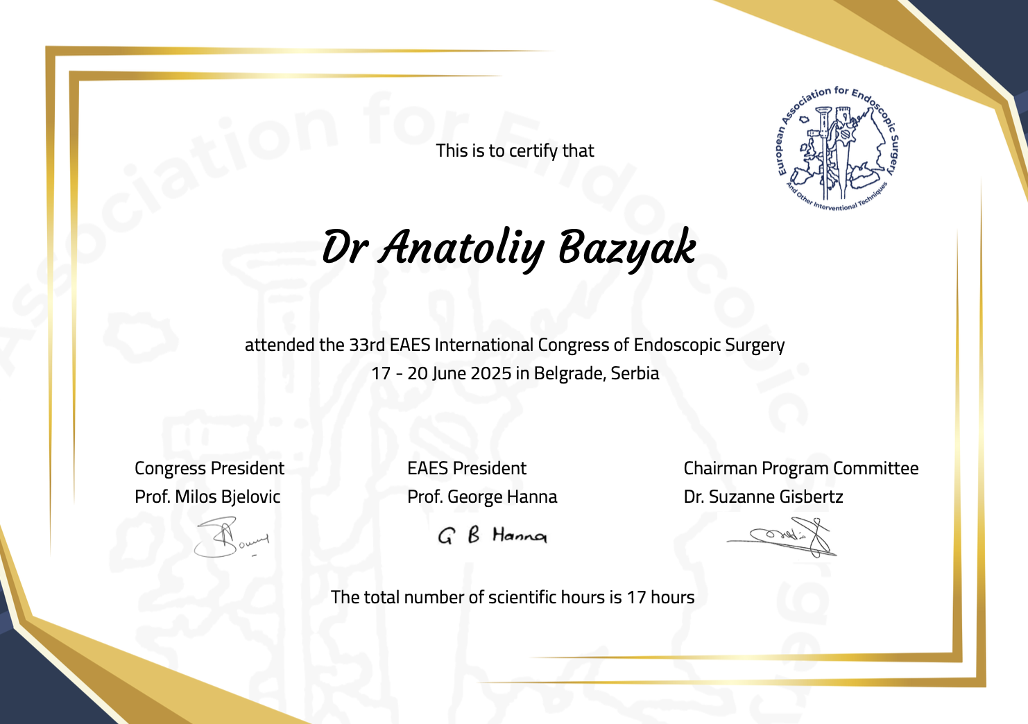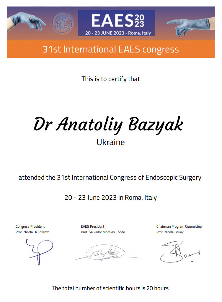 Я є членом Європейської асоціації ендоскопічних хірургів (EAES) та Європейського товариства гінекологічної ендоскопії (ESGE). Це формує для мене постійний доступ до оновлюваних клінічних рекомендацій, консенсусних протоколів і результатів мультицентрових досліджень у галузі ендоскопічної та гінекологічної хірургії. Тому лікування кожного мого пацієнта вибудовується відповідно до актуальних європейських стандартів медицини.