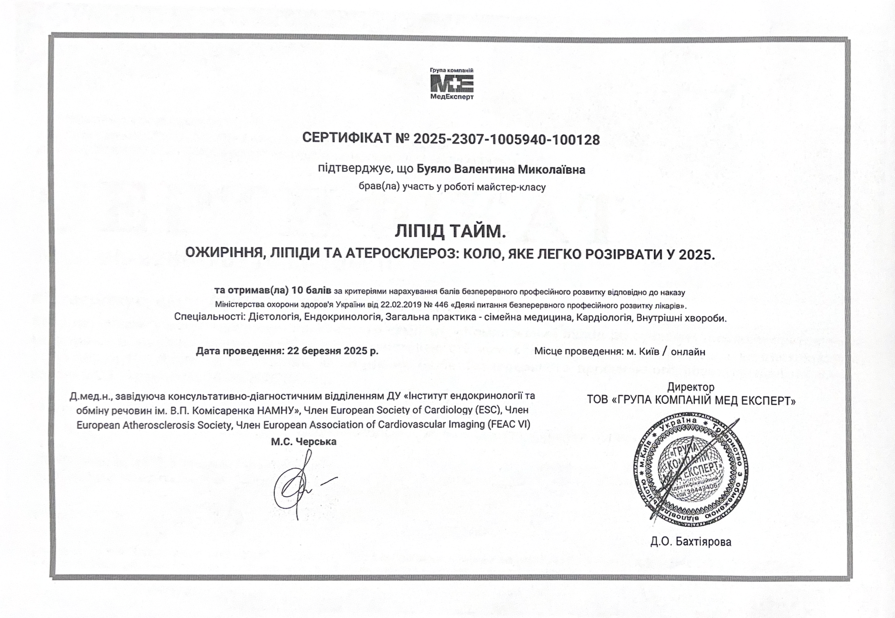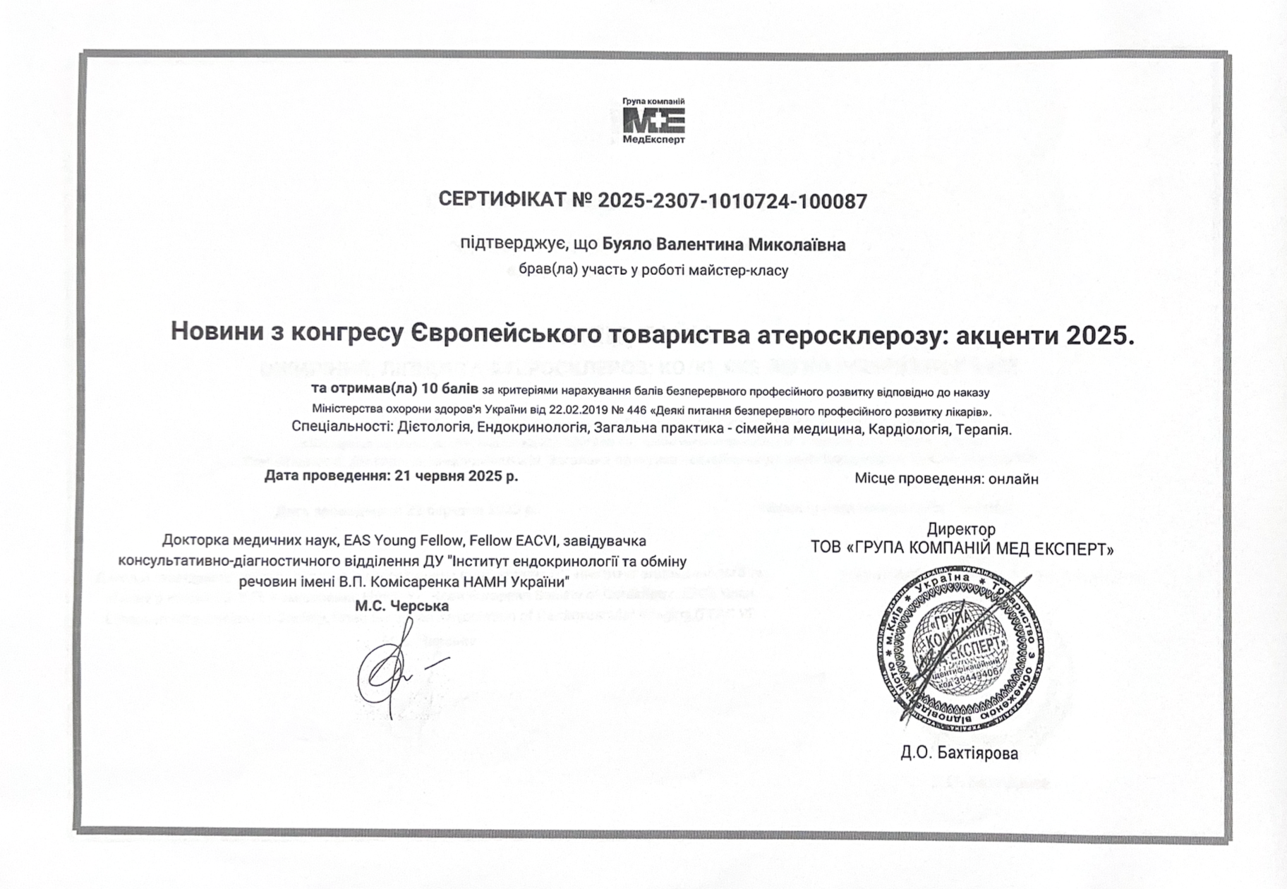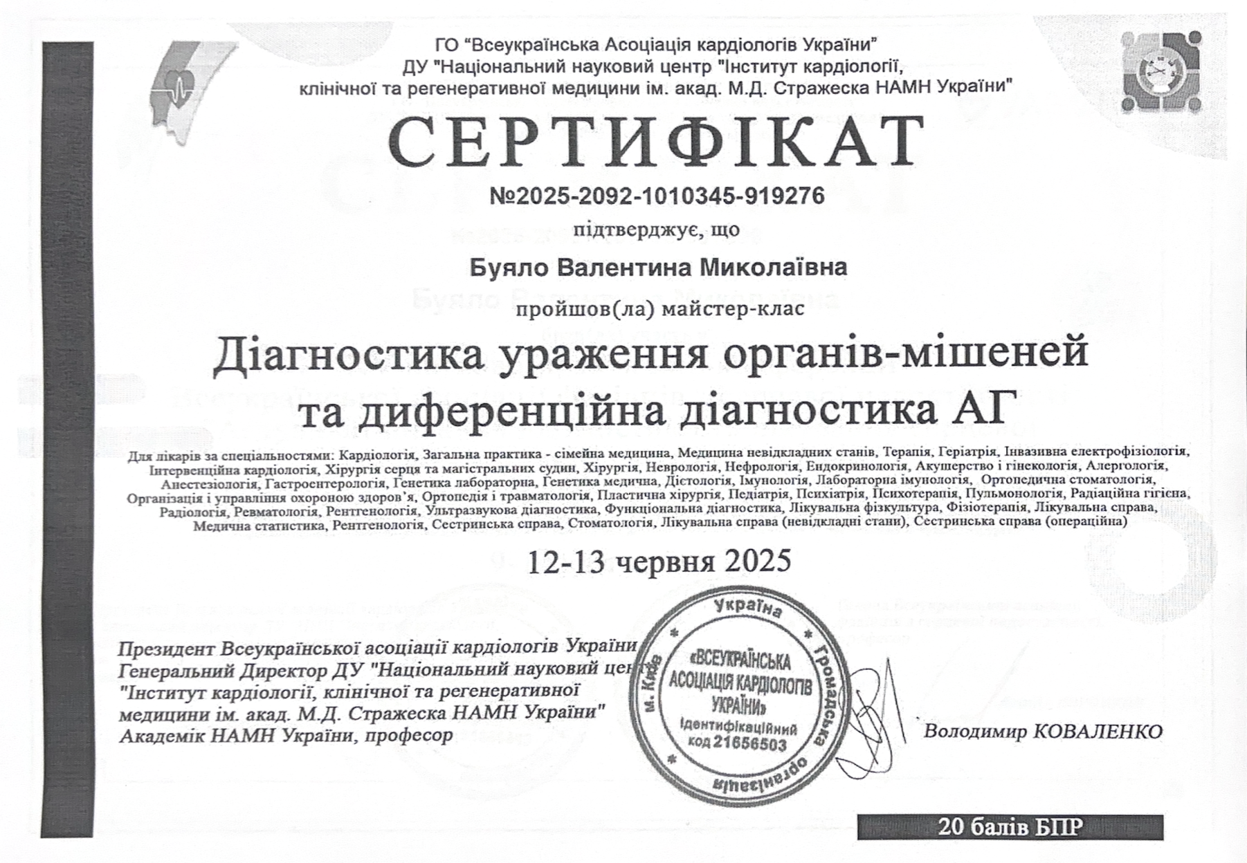 2019 році пройшла атестацію в атестаційній комісії при Департаменту охорони здоровя Київської облдержадміністрації. Було присвоєно кваліфікаційна категорія зі спеціальності – Кардіологія.