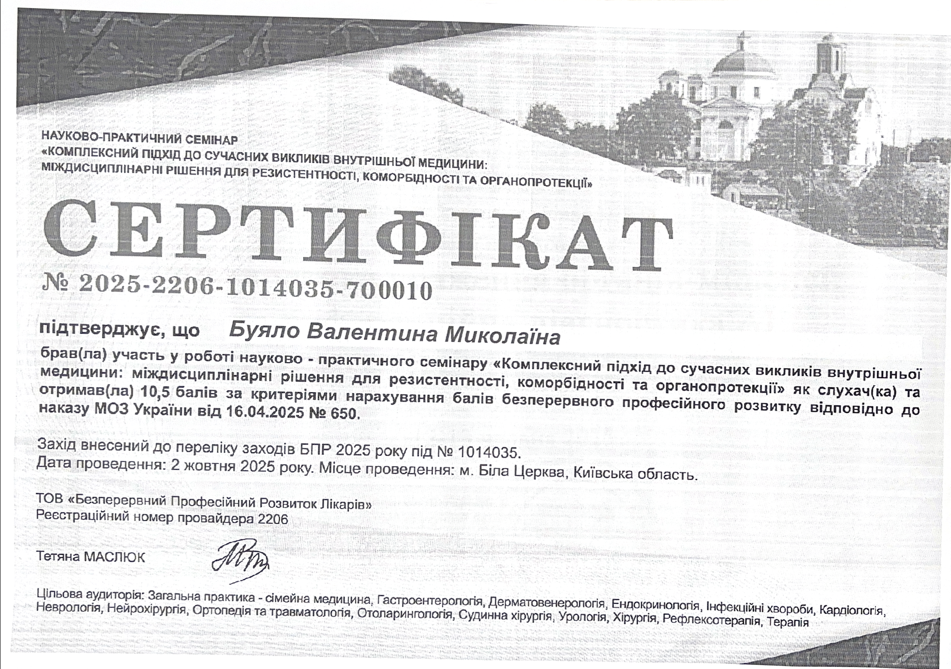 1991 році проходила інтернатуру в Білоцерківському ЦГБ, спеціальність – терапія, де було присвоєно кваліфікацію лікаря терапевта.